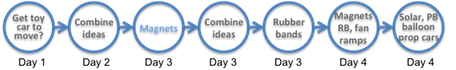 On Day 3, Alice's class observed a student-run demonstration in which magnets were attached to the front and rear of a plastic toy car, and another magnet was used to move the car. Alice then prompted the class to discuss how the magnets caused the toy car to move.